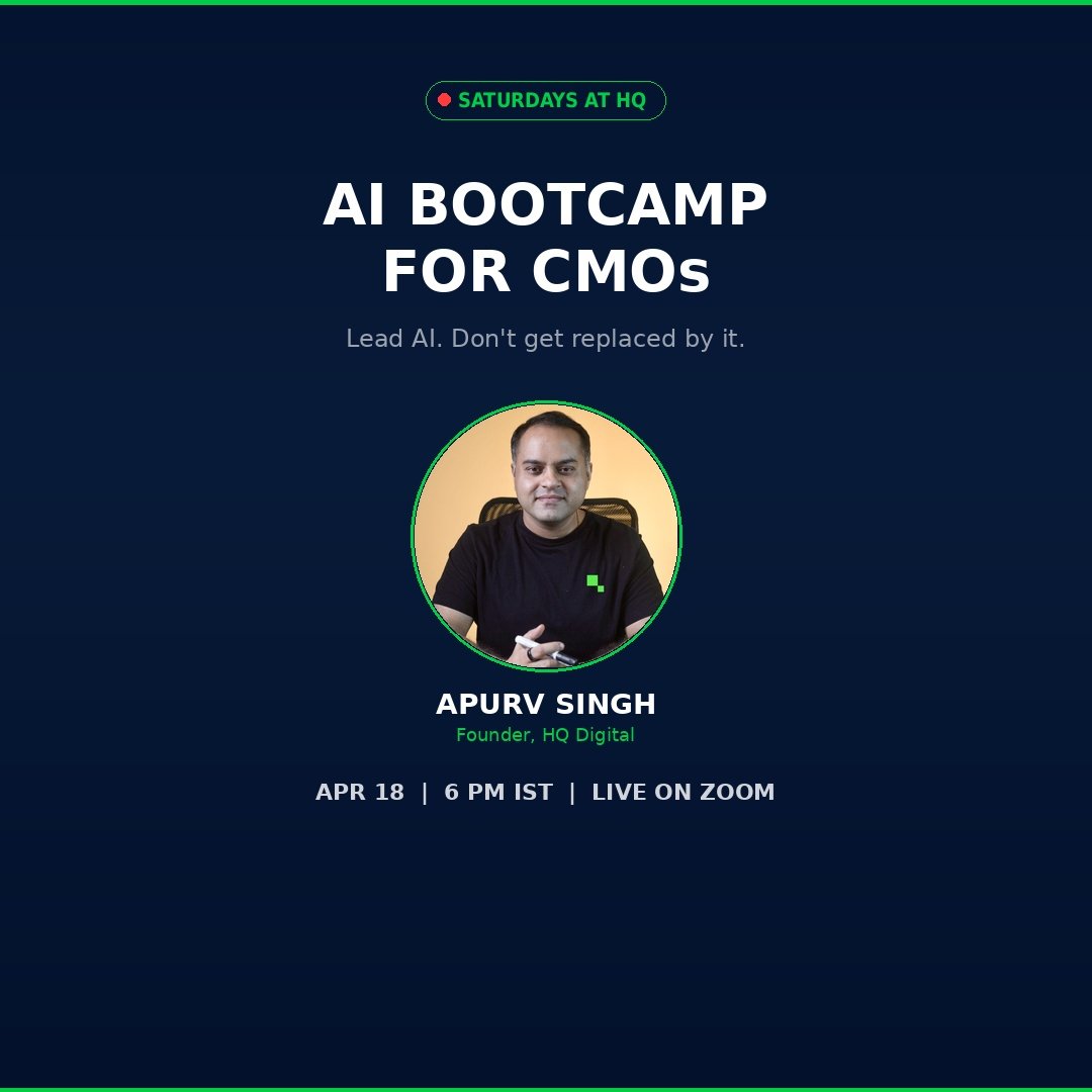 A 90-minute live session for CMOs and marketing leaders. Lead AI. Don’t get replaced by it. April 18, 6PM IST.